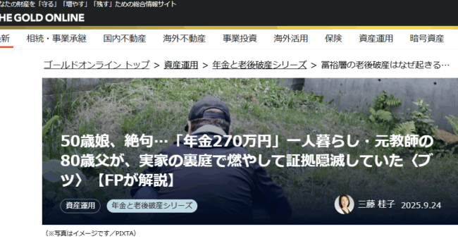 第17回は、「幸せに。大金があります」ふた言で終わった78歳父の遺言…年金8万円“変わり者”の家賃滞納ゴミ屋敷を大片付け。疎遠な45歳息子がよれよれのスポーツバッグから見つけた〈衝撃の遺物〉【FPが解説】 ご興味がございましたら、ご一読いただけると幸いです。