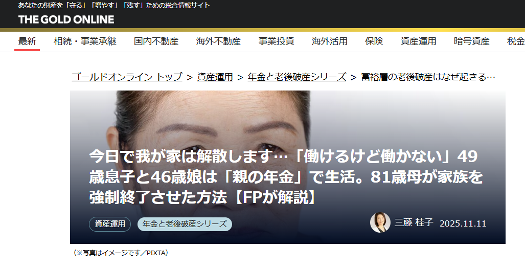 今日で我が家は解散します…「働けるけど働かない」49歳息子と46歳娘は「親の年金」で生活。81歳母が家族を強制終了させた方法【FPが解説】 について、ご興味がございましたら、ご一読いただけると幸いです。
