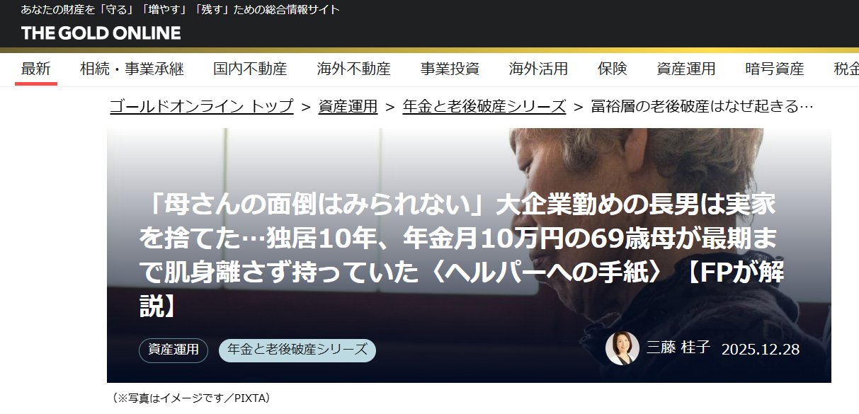 「母さんの面倒はみられない」大企業勤めの長男は実家を捨てた…独居10年、年金月10万円の69歳母が最期まで肌身離さず持っていた〈ヘルパーへの手紙〉【FPが解説】 について、ご興味がございましたら、ご一読いただけると幸いです。