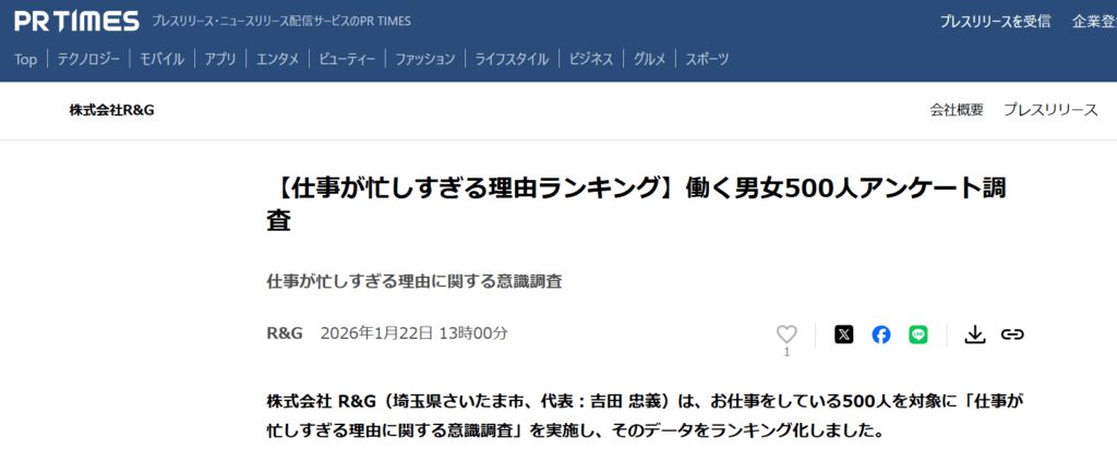 「株式会社R&G(https://r-andg.jp/ )」さんの【仕事が忙しすぎる理由ランキング】働く男女500人アンケート調査」の記事の監修・コメントさせていただきました。