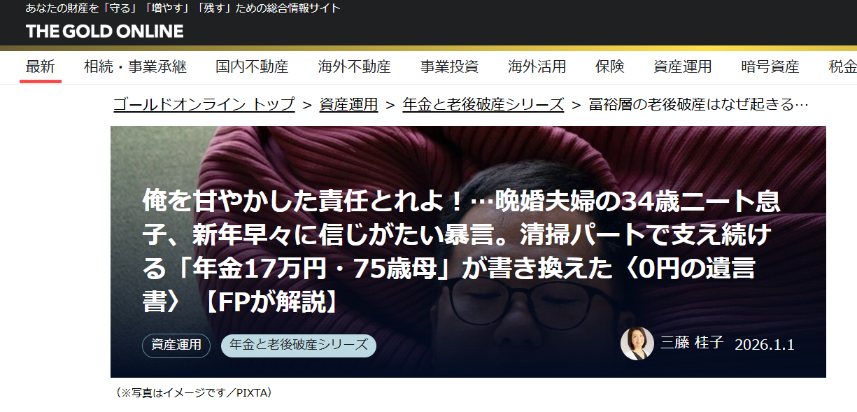 俺を甘やかした責任とれよ!…晩婚夫婦の34歳ニート息子、新年早々に信じがたい暴言。清掃パートで支え続ける「年金17万円・75歳母」が書き換えた〈0円の遺言書〉【FPが解説】 について、ご興味がございましたら、ご一読いただけると幸いです。