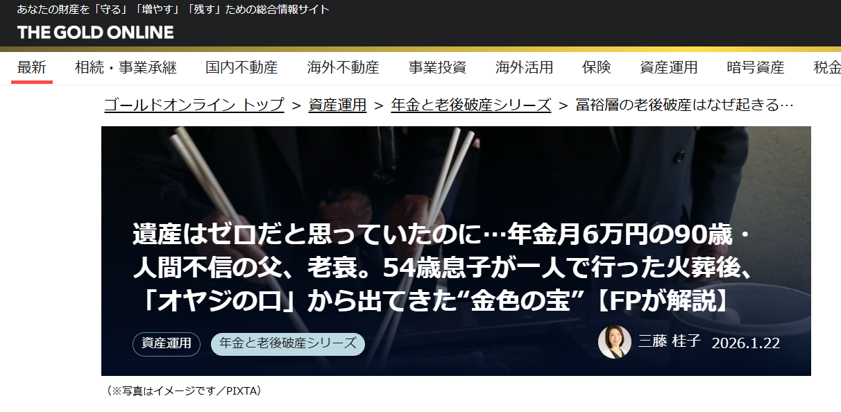 遺産はゼロだと思っていたのに…年金月6万円の90歳・人間不信の父、老衰。54歳息子が一人で行った火葬後、「オヤジの口」から出てきた“金色の宝”【FPが解説】 について、ご興味がございましたら、ご一読いただけると幸いです。