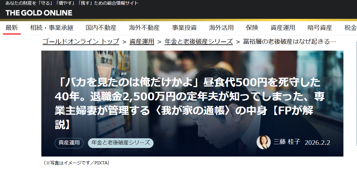 「バカを見たのは俺だけかよ」昼食代500円を死守した40年。退職金2,500万円の定年夫が知ってしまった、専業主婦妻が管理する〈我が家の通帳〉の中身【FPが解説】 について、ご興味がございましたら、ご一読いただけると幸いです。