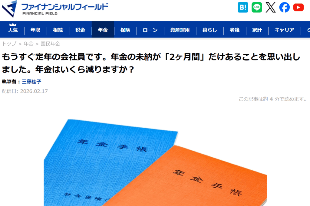 メディア掲載です。お金と暮らしを考えるファイナンシャル・フィールドさんにて、記事が掲載されました。今回は、国民年金編についてです。