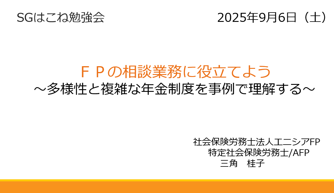 ご縁をいただき、日本FP協会神奈川支部のSG(スタディ・グループ)「SGはこね」さんにて講師をさせていただきました。SGで講師をさせていただく機会を多くいただき嬉しく、今回も驚きあり、笑いありの2時間でした✨